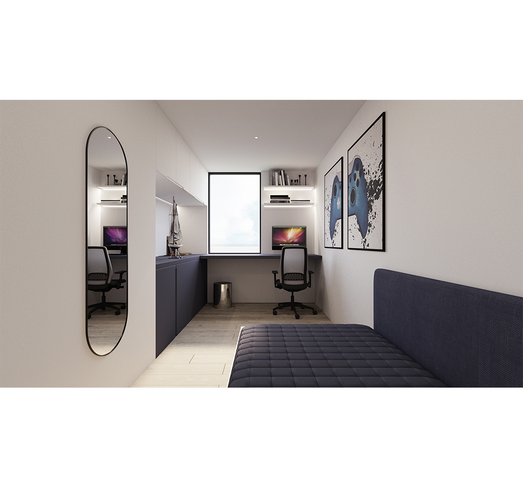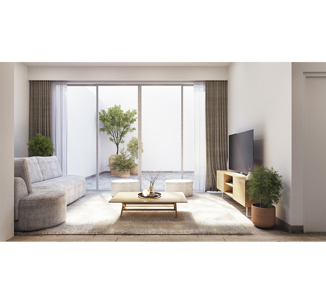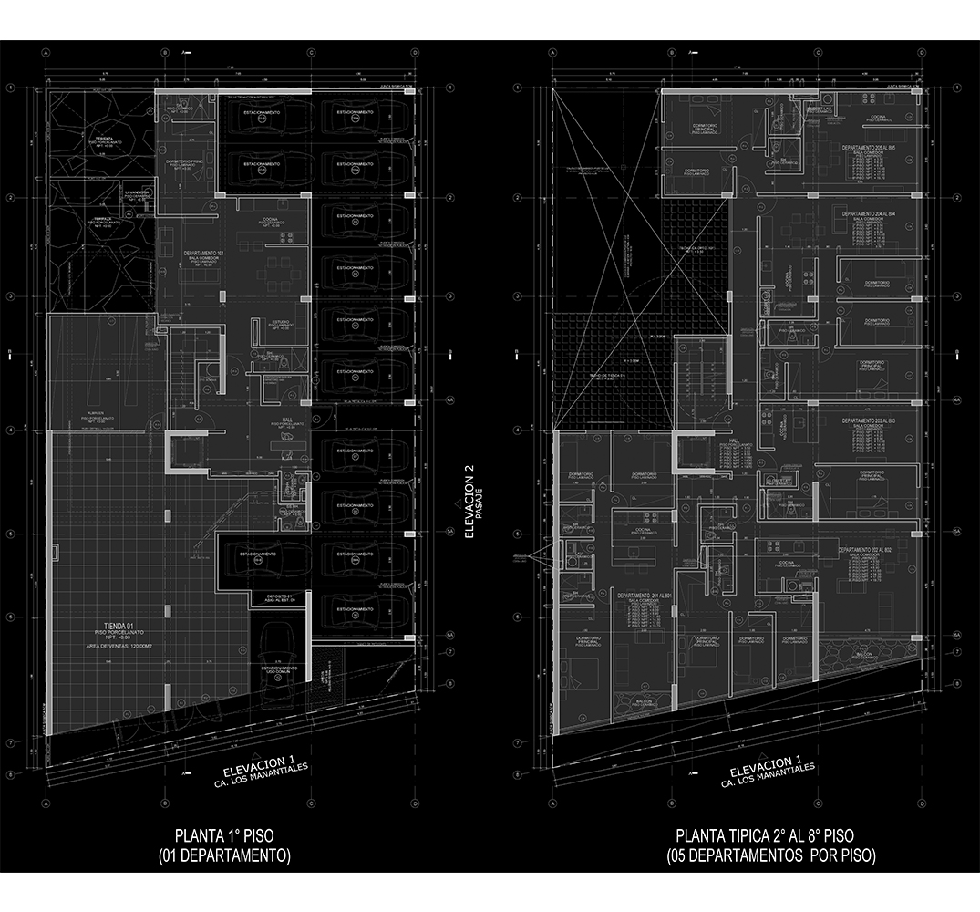 Proyecto multifamiliar desarrollado en un lote en esquina cuyo diseño busca maximizar la exposición de las unidades hacia el exterior. Cada planta típica se organiza de manera que todos los departamentos cuentan con vista externa, aprovechando al máximo las orientaciones y el frente urbano. La ventilación e iluminación natural se garantizan mediante un único vacío posterior que cumple holgadamente las dimensiones normativas, asegurando confort y eficiencia constructiva. En el primer nivel se incorpora un local comercial vecinal, pensado para atender tanto a los residentes del edificio como a la comunidad inmediata, integrando el proyecto al tejido barrial y aportando vitalidad a la calle.