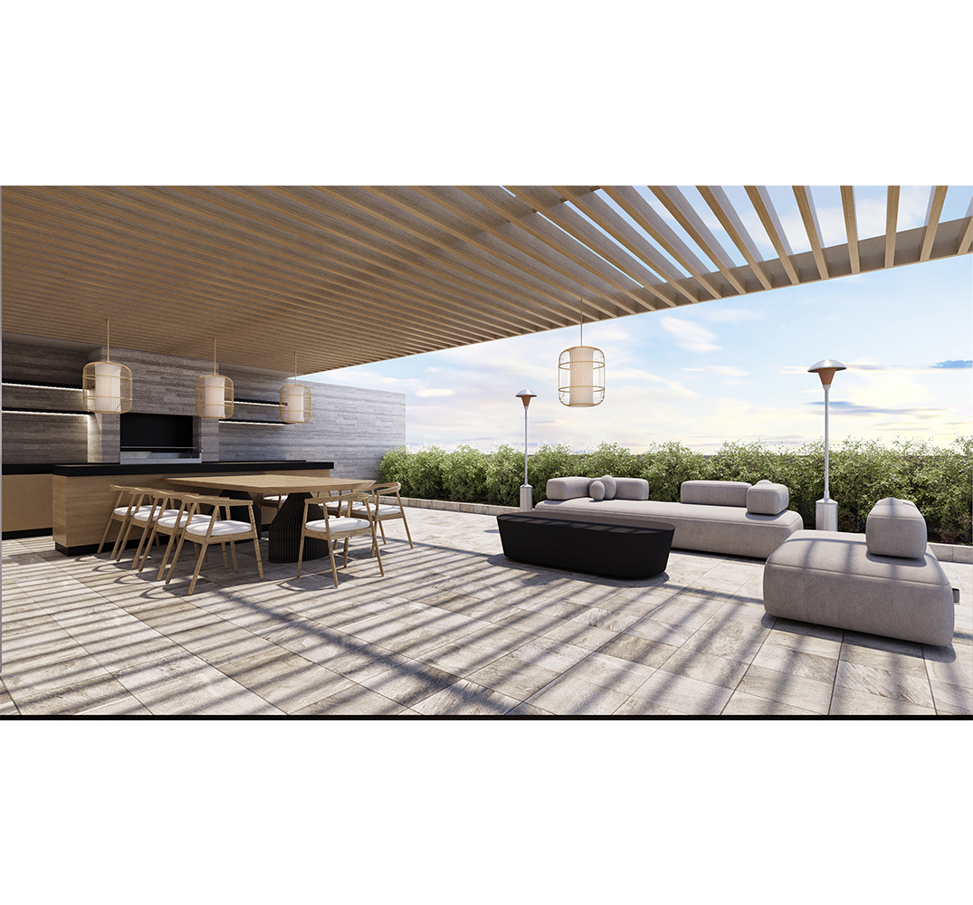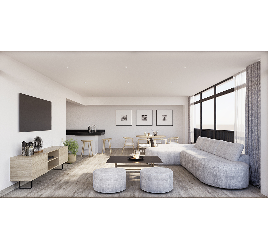 La propuesta arquitectónica se desarrolla a partir de la esquina como punto focal, donde un balcón amplio del departamento principal refuerza la identidad del edificio y su vínculo con la intersección vial. La fachada adopta un lenguaje tectónico y contemporáneo, con vigas invertidas y placas verticales sobresalientes que aportan profundidad y dinamismo. El equilibrio entre líneas horizontales y verticales genera una imagen sólida, ligera y coherente con su estructura.