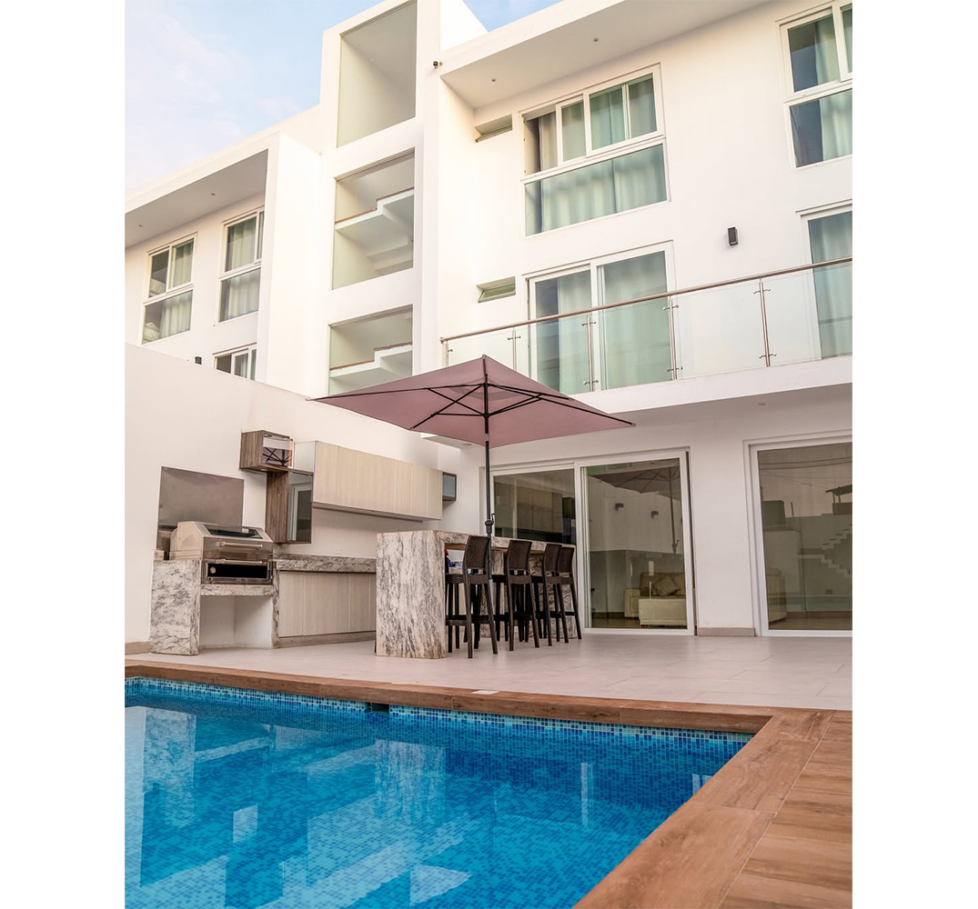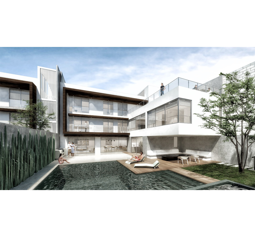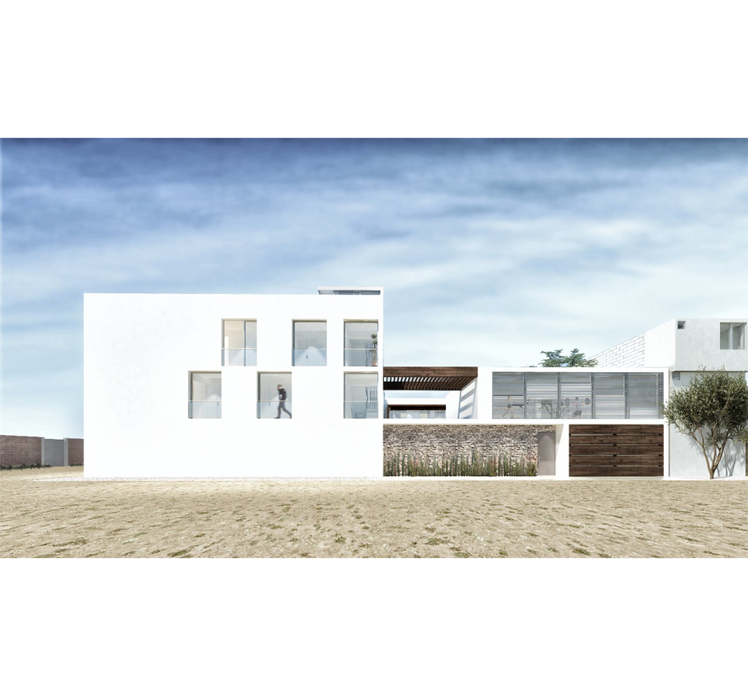 La estrategia arquitectónica se basó en ordenar las crujías de edificación adosadas a las medianeras, liberando el espacio central para las piscinas y terrazas. De esta manera, se garantiza que el vacío central reciba sol durante todo el día, evitando zonas en sombra y generando un microclima cálido y agradable en los espacios exteriores. Las crujías de 5 metros de ancho permiten una organización clara y modular de los ambientes, asegurando eficiencia constructiva y una posible flexibilidad futura en caso de unir las tres casas. El lenguaje arquitectónico combina volúmenes blancos y líneas puras con texturas naturales que evocan la serenidad costera, mientras que las terrazas y áreas abiertas refuerzan la conexión visual y funcional entre interior y exterior.