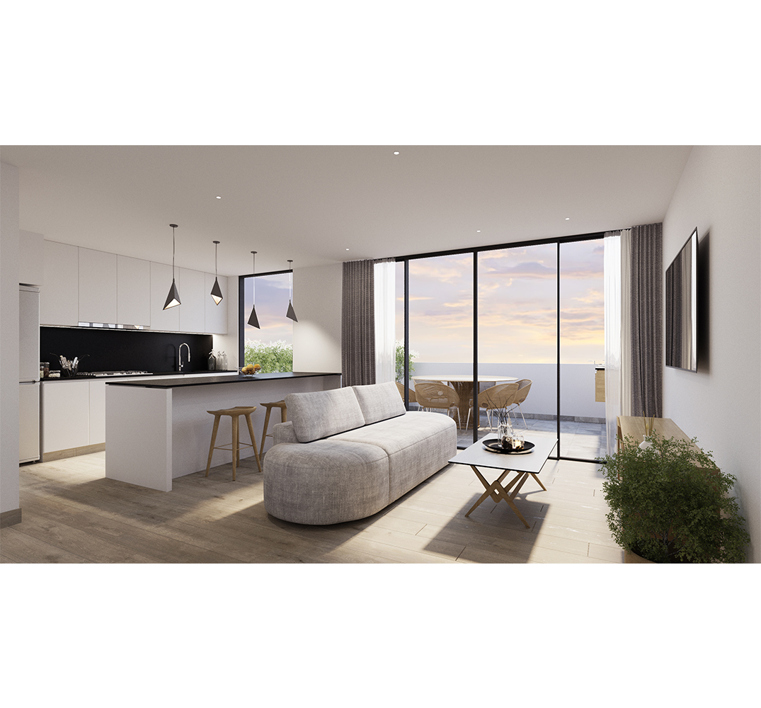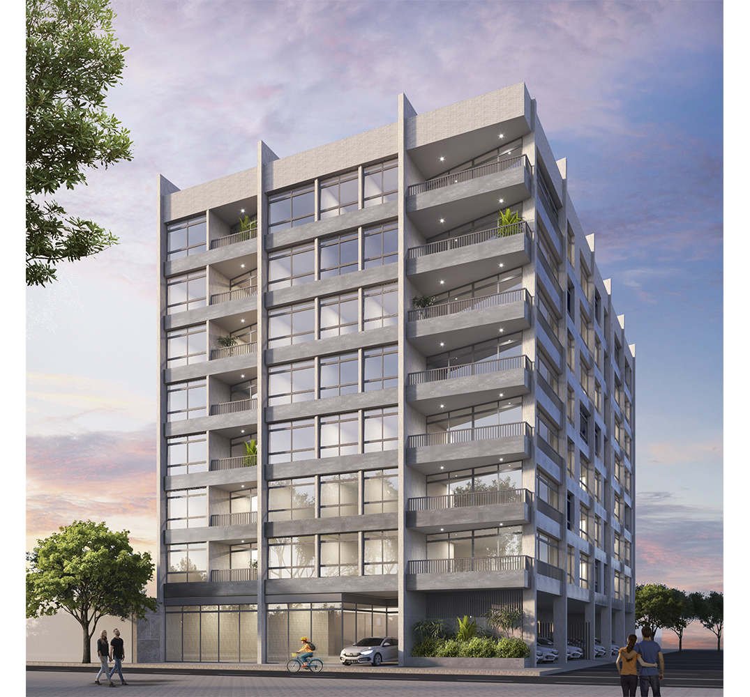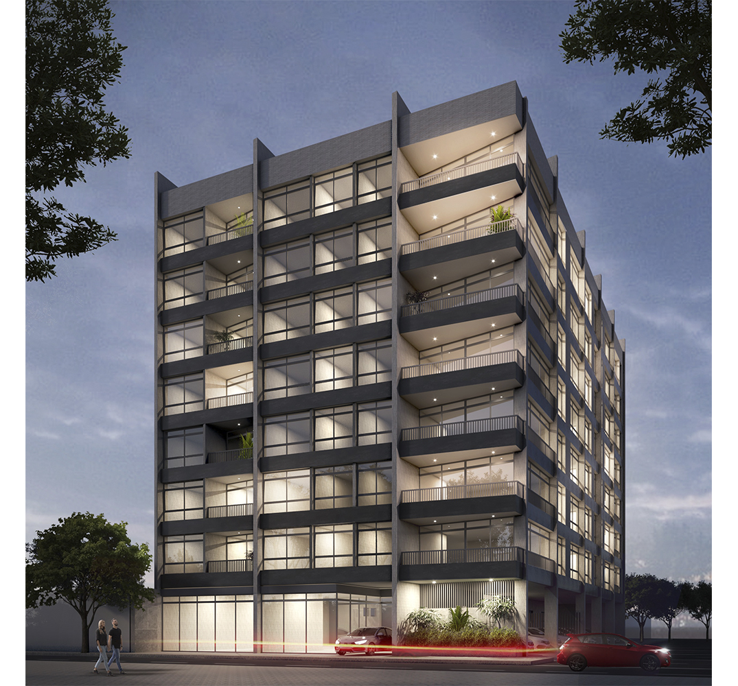 La propuesta arquitectónica se desarrolla a partir de la esquina como punto focal, donde un balcón amplio del departamento principal refuerza la identidad del edificio y su vínculo con la intersección vial. La fachada adopta un lenguaje tectónico y contemporáneo, con vigas invertidas y placas verticales sobresalientes que aportan profundidad y dinamismo. El equilibrio entre líneas horizontales y verticales genera una imagen sólida, ligera y coherente con su estructura.