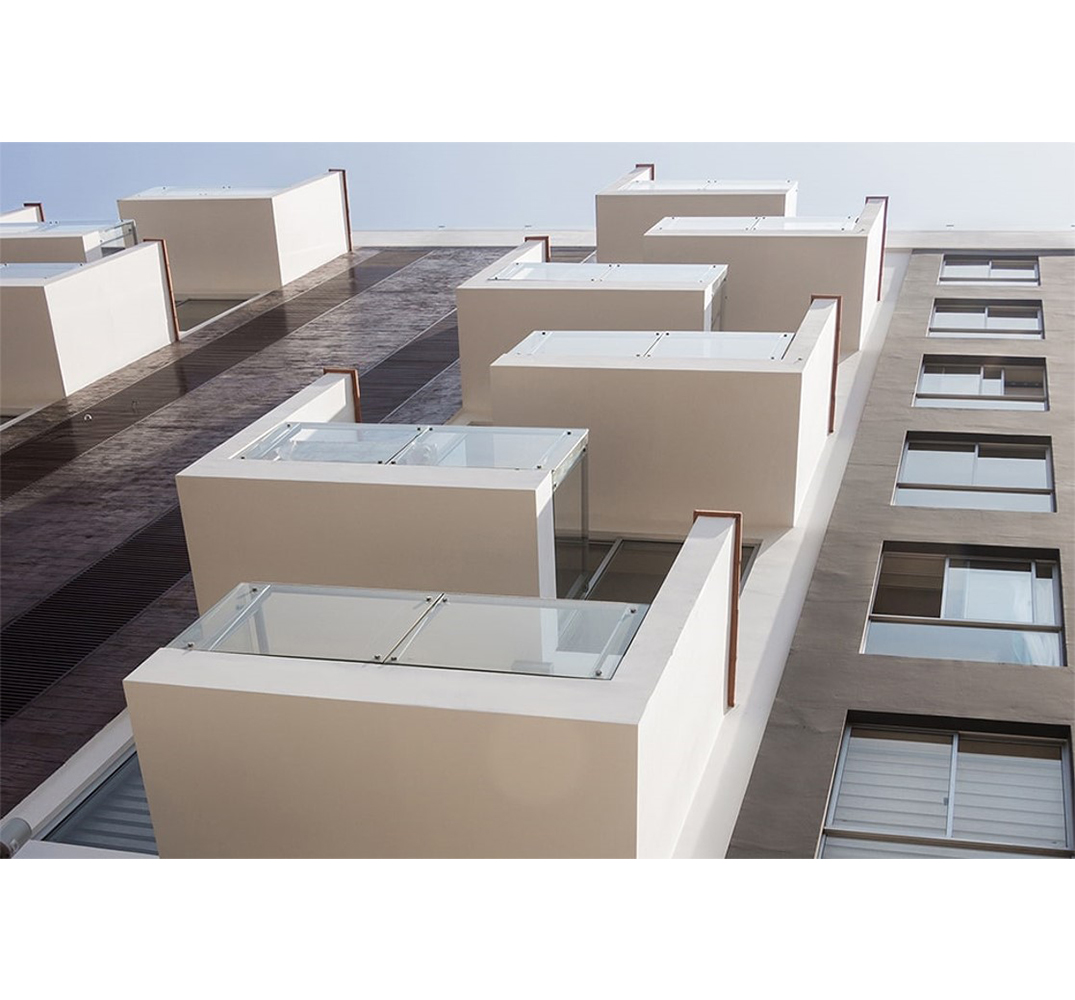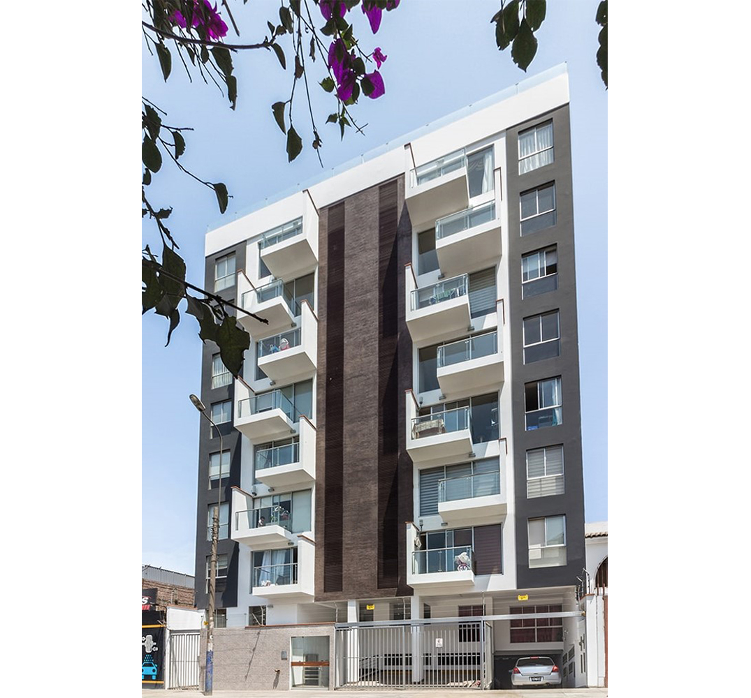 La estrategia arquitectónica consistió en incorporar balcones alternados que sobresalen 1.00 m sobre la línea de fachada, permitiendo ganar superficie útil sobre el retiro sin ser contabilizada como área construida. Esta solución incrementó la amplitud perceptiva y real de los ambientes principales, generando un mayor valor inmobiliario por unidad sin afectar el cumplimiento normativo. Los balcones fueron articulados mediante elementos verticales que, además de otorgar ritmo a la fachada, mantienen la privacidad entre departamentos y direccionan la visual hacia la Av. Javier Prado, reforzando la relación visual con el entorno urbano.