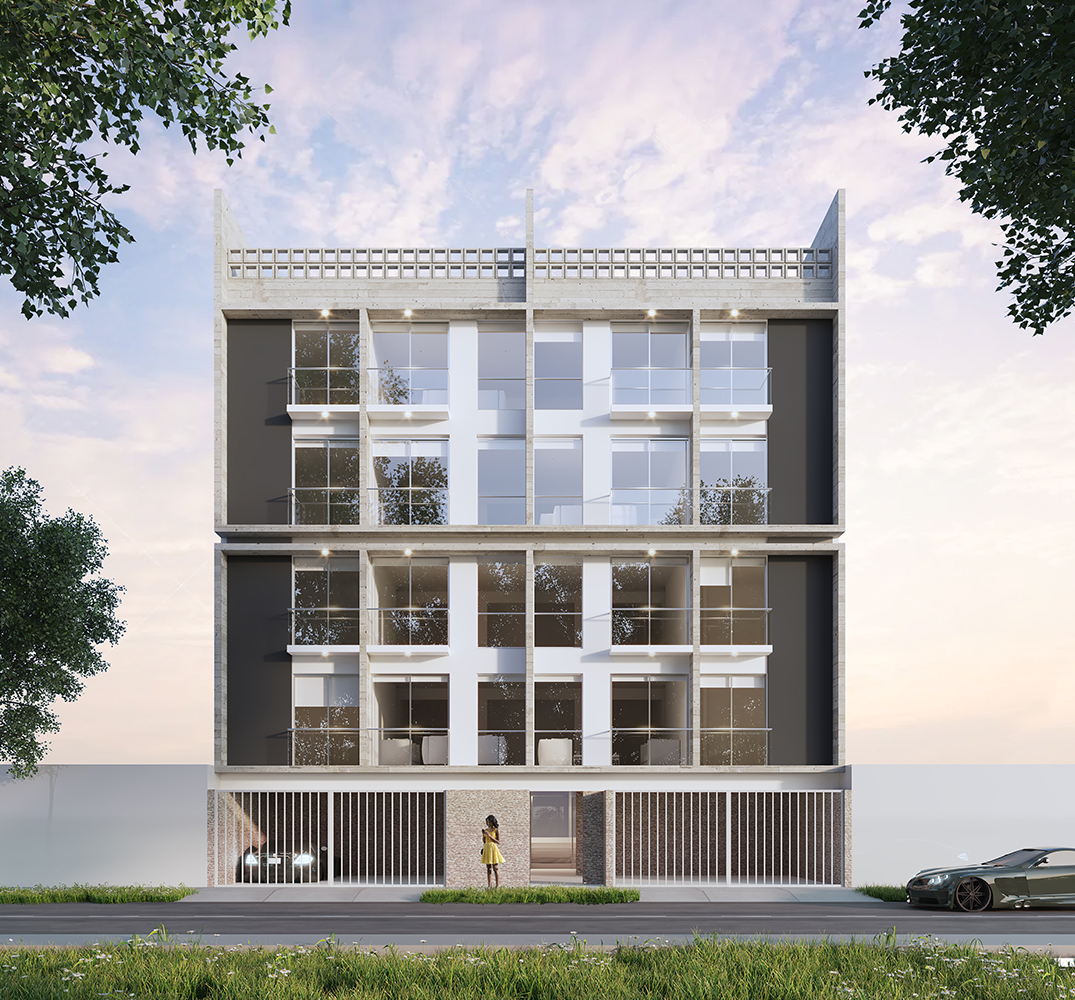 Proyecto multifamiliar de vivienda económica basado en un diseño eficiente y de calidad espacial, demostrando que la arquitectura puede generar valor incluso en contextos de bajo costo. Cada nivel cuenta con dos departamentos de 70 m² más balcones, organizados en una planta compacta y simétrica con núcleo central que optimiza recorridos y costos. Frente a un parque, la fachada se abre al paisaje, integrando sala y dormitorios principales con balcones amplios y funcionales.