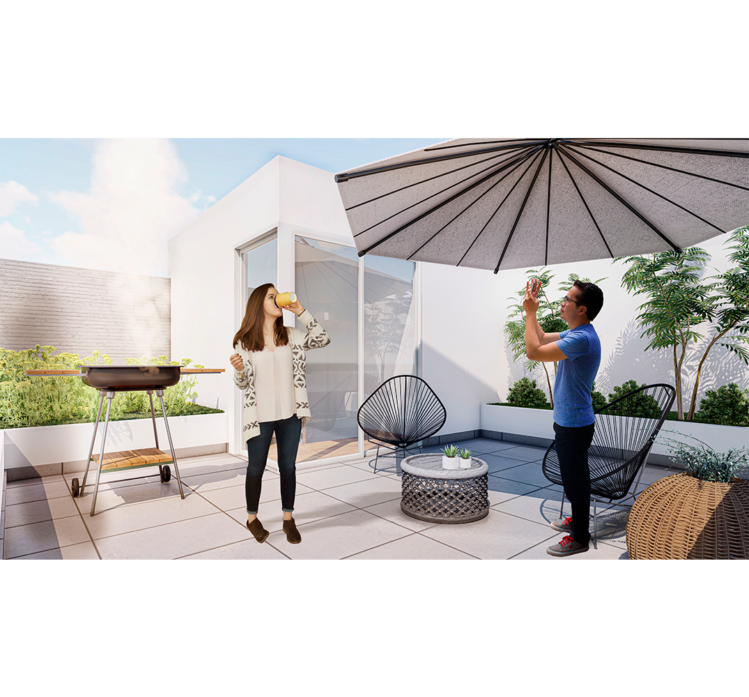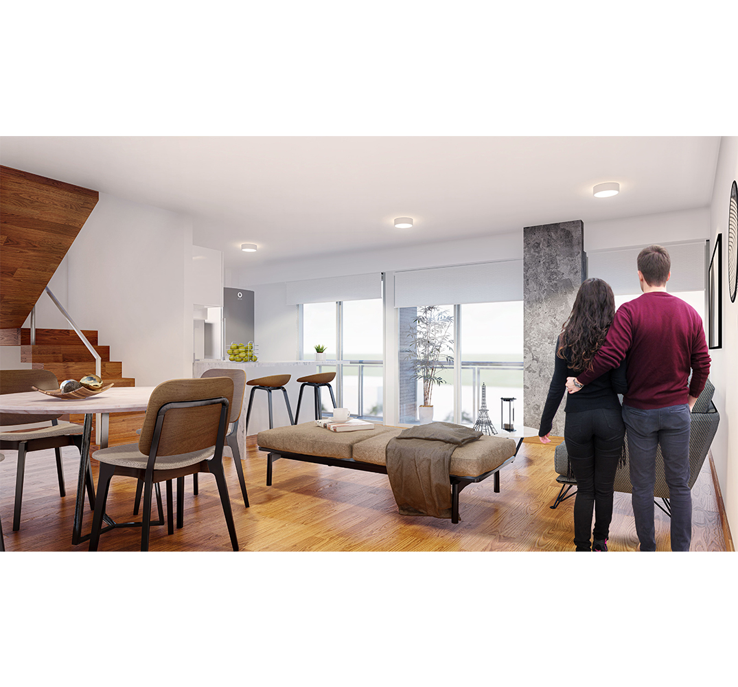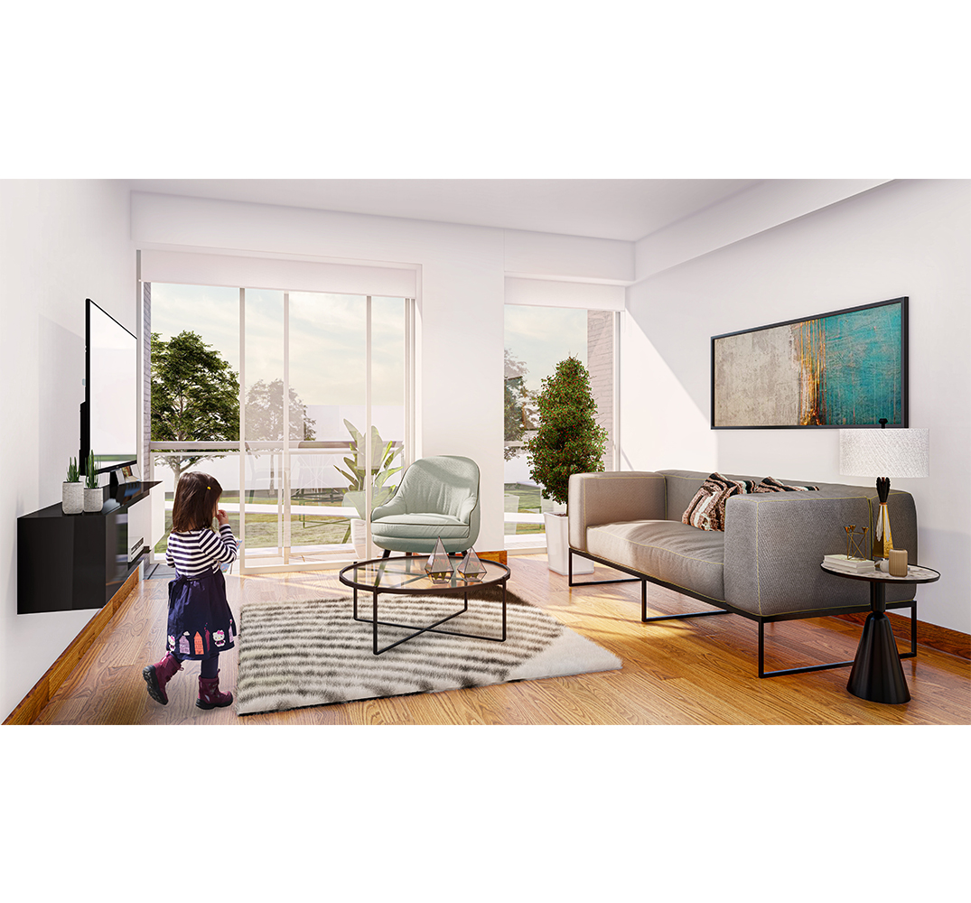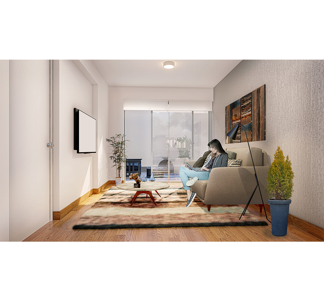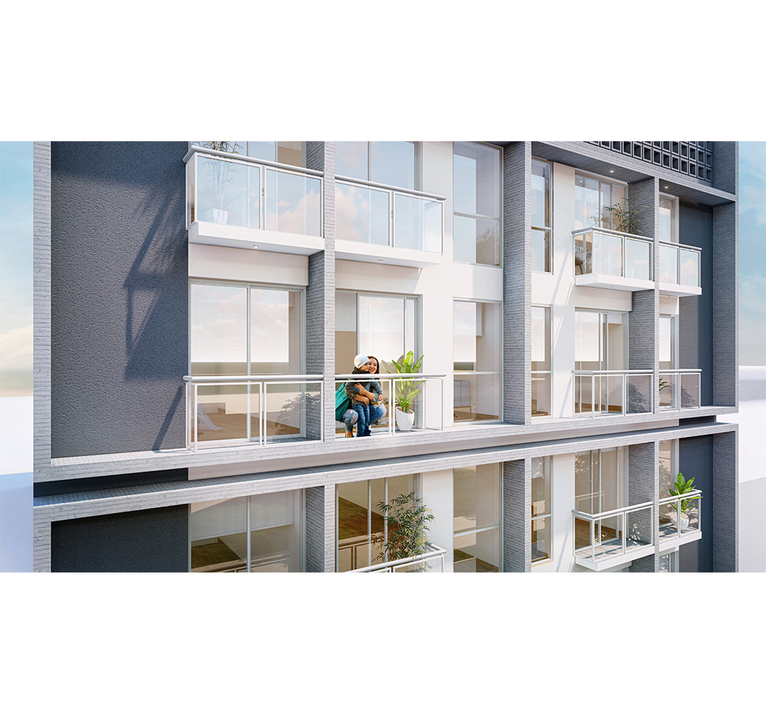 La composición de la fachada parte del deseo de aprovechar la vista al parque y otorgar a cada vivienda una conexión directa con el exterior. Los balcones, entendidos como una extensión de la sala, amplían visualmente los espacios y promueven una relación cotidiana con el entorno. Un marco estructural cada dos niveles enfatiza la verticalidad del edificio, aumentando la escala visual y diferenciándolo de las edificaciones vecinas. Este recurso compositivo aporta jerarquía y presencia urbana, sin incrementar los costos de construcción. El lenguaje arquitectónico combina sobriedad y proporción, transmitiendo la idea de vivienda digna y accesible sin renunciar a la calidad formal.